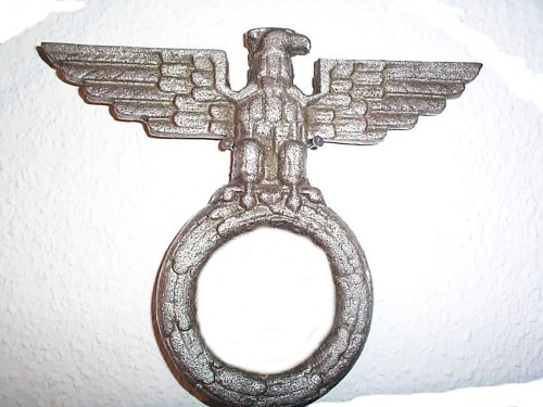 Reichsadler Stahlguss Bei dem Reichsadler könnte es sich um einen Adler für den Reichsbund (Deutscher Beamten) handeln. Der Adler wurde scheinbar als Hohlguss hergestellt. Später wurde der hintere Teil nochmalig ausgegossen. Die Flügel wurden im oberen bereich abgeschliffen! Der Adler ist sehr grob gegossen, was für die Zeit 1933 - 1945 unüblich war. Bei dem Adler handelt es sich nach meiner Meinung um den Nachguß. Diese Form des NSDAP Parteiparteiadler wurde mit einem Standfuß ausgeführt. siehe LINK Der Adler hat eine Höhe von 18 cm und eine Flügelspannweite 21 cm |