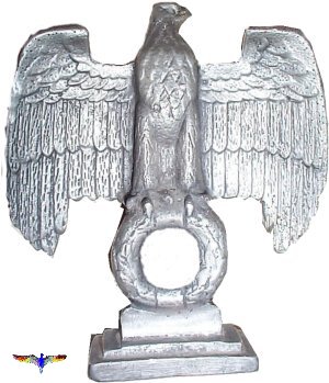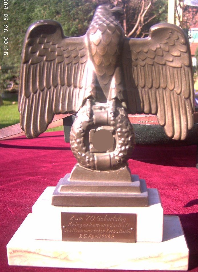 Hoheitsadler der 3.Reiches in Form des Reichsadler von der Luidpoldarena (bekannt aus der Wochenschau) Das Material des Hoheitsadlers ist Blei. Der Adler wirkt abgenutzt und Unscharf. Nach meiner Meinung handelt es sich hier um ein Versuchsstück aus der Zeit 1933-1945 (oder um die Kopie) eines Tischadlers (Ehrenpreis) ( siehe LINK ) Was interessant ist, ist das dieser Bleiadler um ca. 20% kleiner ist als die mir bekannte Variante. Dass dieser Größenunterschied auf das Schrupfmaß beim Gießen zurückzufüren ist ist unwarscheinlich. Aus diesem Grund, sowie afgrund der optischen Betrachtung, halte ich es für ein art Versuchs- oder Probestück. Die Figur hat eine Höhe von 18 cm und dien Flügelspannweite von 15 cm. |