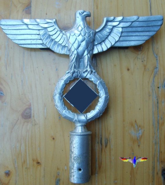 Fahnenspitze des Deutschen ReichesDie Fahnenspitze trägt den Reichsadler des Deutschen Reiches wie er von dienstlichen Stellen verwendet wurde. Solche Fahnenspitze wurden bei Städten, Gemeinden, sowie bei staatlichen- oder städtischen Organisationen verwendet. Nachdem gerade in solchen Positionen nur Angehörige der NSDAP waren kann man hier auch von Parteiadleradler oder NSDAP-Adler sprechen.Das Material der Fahnenspitze ist Aluminium. Die Flügelspannweite beträgt 25cm, die Gesamthöhe beträgt 25,5 cm. Die Fahnenspitze ist gestempelt mit RZM M3/34/35. Bei der Fahnenspitz handelt es sich nach meiner Meinung um ein zeitgenössisches Original. Bei Kauf einer solchen Fahnenspitze sollte man aber vorsichtig sein, da von diese Fahnenspitzen auch sehr gut Kopien verkauft werden. |